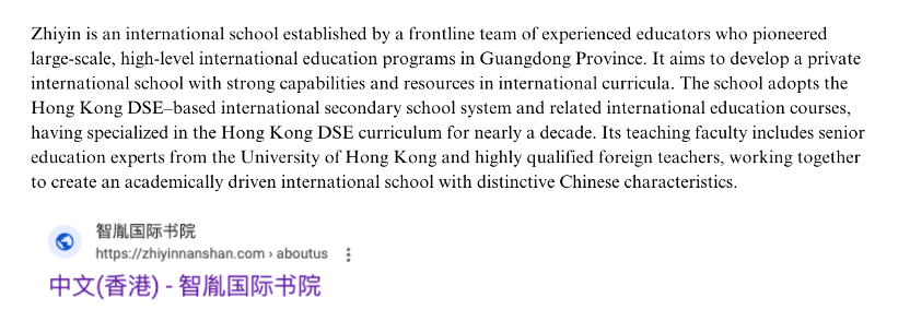 Shenzhen Zhiyin International School was founded by an experienced team in international education. As part of Hongyi High School, it opened in 2024, offering a range of programs, including DSE courses, arts-focused tracks, and preparation classes for students from grades 9 to 12.
