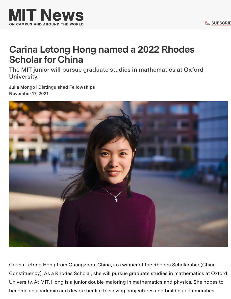 Carina Hong discovered her passion for mathematics in middle school via a free Olympic math training program. By high school, she was one of only four girls representing Guangdong province at the China Mathematical Olympiad. In 2018, at age 17, she entered MIT as a double major in Mathematics and Physics, completing both degrees in three years while coauthoring nine research papers on topics ranging from modular elliptic curves to pop-stack sorting algorithms.